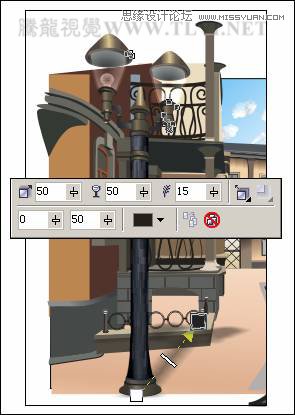(16)将组成路灯的相关图形全部选择,按下键将其群组,并将群组对象放置在视图相应位置,然后选择工具箱中的“交互式阴影”工具,为路灯添加阴影效果,如图3-68所示。