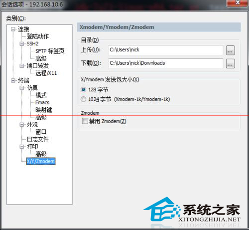 6、需要设置上传和下载的默认目录,点击SecureCRT的菜单栏中的 选项=》会话选项。打开会话选项对话框,点击分类中的 终端=》X/Y/Zmodem。