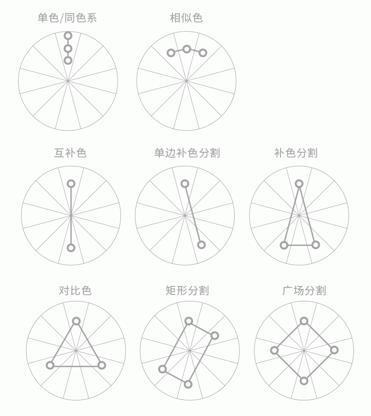 我们常见的配色方式有同色系、相似色、互补色、对比色搭配,这里在互补色里面划分出了补色分割(与互补色相邻的两边的颜色)以及单边补色分割,此配色方式的目的是为了让配色在形成鲜明对比的情况下又能有较高的融入度,较互补色而言柔和很多,补色分割在emart广告里面用的很多。而矩形分割、广场分割则是在多色搭配情况下出现的配色方式,下面我们单独举例说明每个配色方式。
