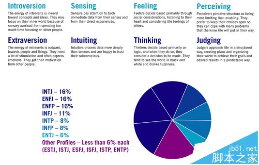 这份研究使用了Myers Briggs标准去划分调查对象,这份性格测试测量了四种特性。尽管很重要,态度-内向/外向纬度,只是其中的一种。其他特性是观察力、判断和生活方式。每种特点都有自己的标准或者本质对立,开拓性心理学分析家Carl Jung对他们进行了区分。