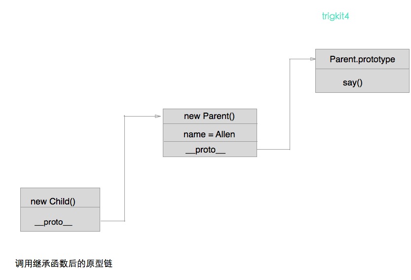 执行到这里的时候并没有完,在say()方法中引用了this.name,this指向构造函数所创建的对象,在这里,它指向了new Child()这个区块,然而,new Child()中并没有name属性,为此,将查询中间区块,而中间区块正好有name属性,至此,原型链的查询完毕。