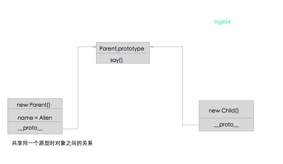 子对象和父对象共享同一个原型,并且可以同等的访问say()方法。然而,子对象并没有继承name属性