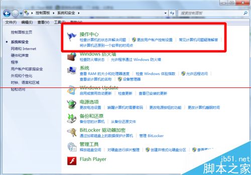 3、进入系统与安全界面之后,我们点击最上方的操作中心。进入操作中心。