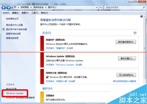 4、进入操作中心,我们可以看到左下角有一个Windows Update选项,我们点击进入。
