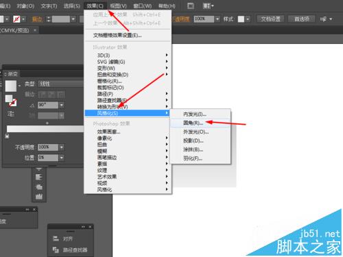 2、然后选中正方形到效果—风格化—圆角,如图所示