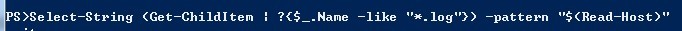 Get-ChildItem是得到当前面目录下的所有项,然后通过管道| 输入给?(就是Where-Object的别名)来筛选,及筛选当前目录下的log文件,$_代表当前对象,即前面查出的结果,-like使用了模式匹配,$(Read-Host)是从控制台读入,类似C#中的ReadLine()(相应的标准输出是Write-Host),即当用户输入一个关键字后,命令会从后向前的执行。