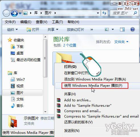 在刚才Win7的图片库文件夹界面中,我们还可以右键点击选定图片文件夹,从右键菜单中选择“使用Windows Media Player播放”,这样Win7系统会使用媒体播放器来播放文件夹中的图片,也非常方便。