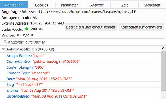 要测试你的配置是否有效,可以用火狐浏览器的开发者工具中的网络分析功能,然后用火狐访问一个静态文件(比如一张图片)。在输出的头部信息里,应该能看到 Expires 头部和有 max-age 标记的 Cache-Control 头部(max-age 标记包含了一个以秒为单位的值,比如 31536000 就是指今后的一年)