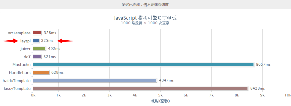 •性能卓绝,执行速度比号称性能王的artTemplate、doT还要快将近1倍,比baiduTemplate、kissyTemplate等快20-40倍,数据规模和渲染频率越大越明显