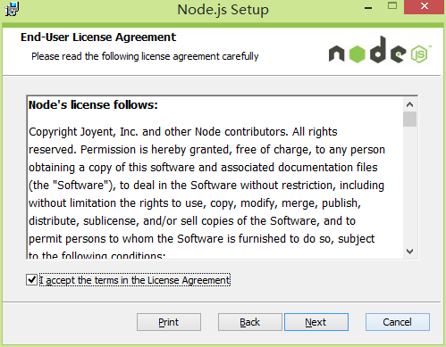 步骤2:点击Next、显示Node.js的许可协议页面:
