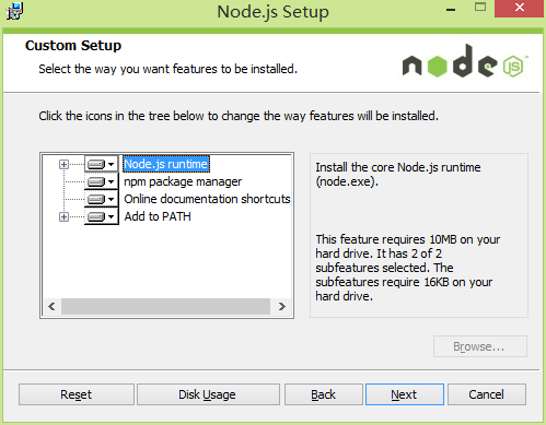 步骤4:Node.js默认安装路径为“C:Program Filesnodejs”,你可以修改,在这里我改到了D盘,单击Next,出现安装模式及模块选择界面:
