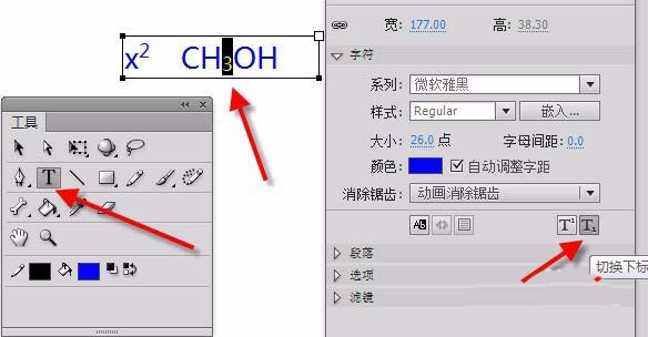 但要注意,必须先选中字符后,再点击这里,才生效(见下图,是先选中了2之后再使用上标的功能,同理,先选中3之后再使用下标的功能)