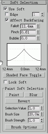 usesoftselection(应用软选择)复选框是软选择功能的开关,只有将它勾选软选择才会起作用;edgedistance(边距)项勾选后可以由边的数目来限制作用的范围,具体的值可以在后面的输入框中设定,而且它将使作用范围成方形(一般情况下软选择的作用范围是圆形);勾选affectbackfacing(影响背面)项,作用力将会影响物体背面,默认为勾选状态。