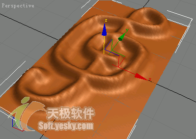下方的这个区域为paintsoftselection(绘制软选择区域),这是3dsmax7中新增的功能,非常的强大实用。顾名思义,我们可以用鼠标直接在物体上绘制出软选择的区域,可以绘制出任意的图形,呵呵,先来试一试,在一个多边形平面上绘制出如图47所示的图案,就和用笔画画儿一样。再将选择区域向上移动一些,加上一级细分,就得到了如图48所示的效果,很有意思吧。
