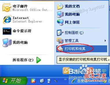 点击屏幕左下角的“开始”按钮,从弹出的菜单列表中选择“打印机和传真”: