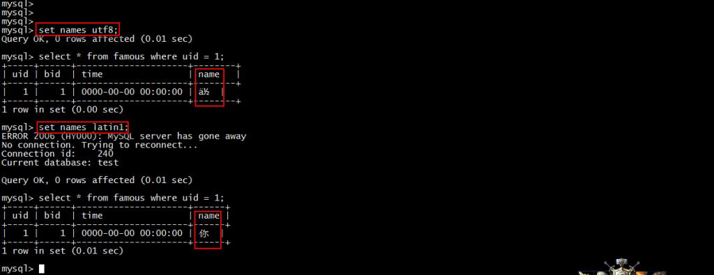 通过SET NAMES utf8命令同时设置character_set_client/character_set_connection/character_set_results的字符集