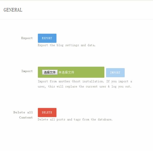 由于更换了数据库,新的 MySQL 数据库中没有任何内容,也没有任何登陆账号,这时需要我们新建一个临时账号,然后再次登陆进 http://your-domain.com/ghost/debug 页面(如上图)将之前导出的数据重新导入。