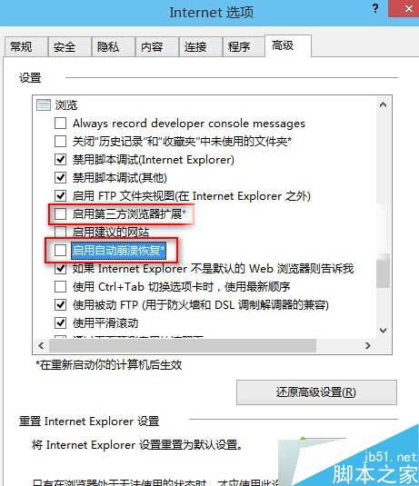 3、切换到“高级”选项卡,在“设置”窗格中向下滚动设置项,找到“浏览”区域的“启用第三方浏览器扩展”以及“启用自动崩溃恢复”选项,取消勾选;