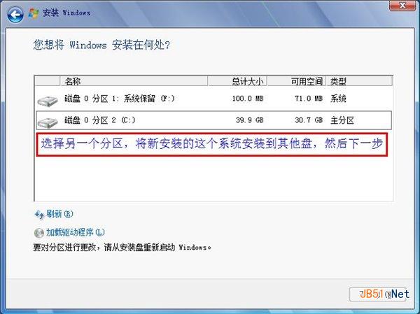 7、如下图提醒,在安装过程中选择安装在何处时,选择一个新的分区,确保不是覆盖安装。