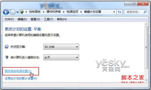 首先我们需要将Win7电源管理中的关闭硬盘和进入休眠的选项全部设置为“从不”,不然硬盘关闭是没有办法下载的。我们依次进入Win7系统的“控制面板—硬件和声音—电源选项—编辑计划设置”,点击“更改高级电源设置”。