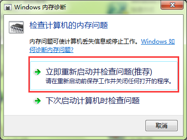 4、弹出下面窗口,一般我们直接点击“立即重新启动并检查问题”,当然前提是你要先把系统中运行的文件先保存下,以免数据丢失。