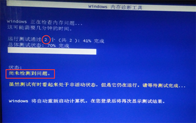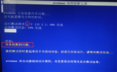 5、重启电脑后系统会自动检测,下面就是检测画面,我们主要看下面的状态,如果它一直显示“尚未检测到问题”,就说明内存是正常的。这个过程会分为两个阶段,下面这个是第一阶段。