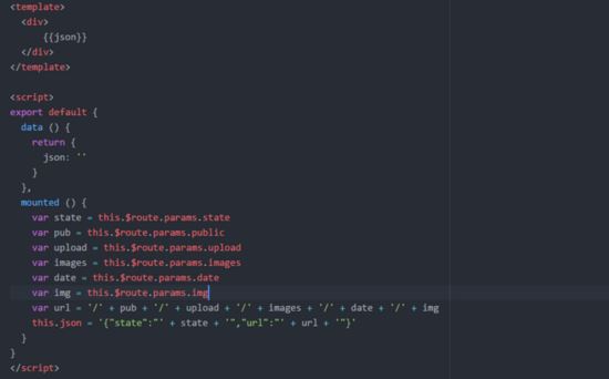 3、创建一个页面展示JSON数据。我直接用路由参数接收返回的结果后再拼接,整个JSON接收不到,所以只好拆开了,没有显示所有的JSON,只获取state和url。暂时不懂不访问接口用什么方式接收后端数据,如果有好的解决方式欢迎提出。
