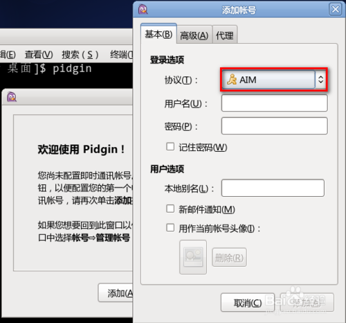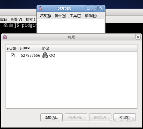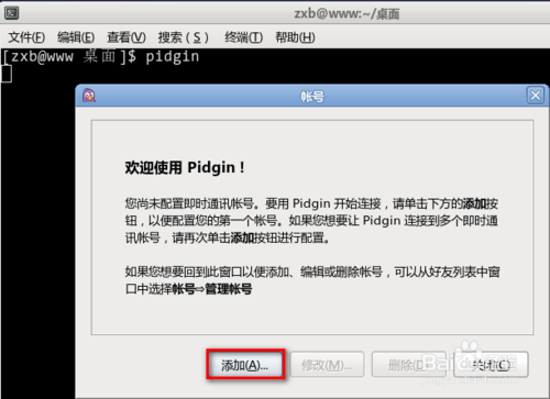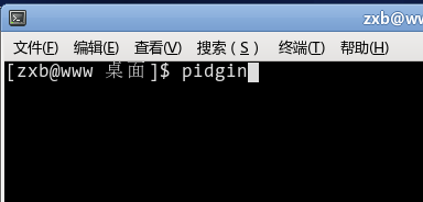 2、进入终端,键入命令 pidgin,回车。在这儿说明一下,一些常用的 linux 操作系统安装完成后都自动安装了这个软件。如果提示没有安装,可以先进行安装。