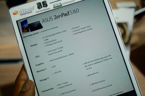 在性能上Zenpad S 8.0装备了英特尔64位的Atom Z3580四核处理器,4GB的内存,PowerVR G6430 GPU,机身尺寸为203.2×134.5×6.6mm,重量为298g。机身正面配置了500万像素前置摄像头和800万的后置摄像头,16GB的内置存储。