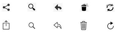 当你在设计Android/iOS应用时,不要使用其他平台特定的UI元素。各平台为某些常用功能使用一套典型的图标,比如分享、新建和删除。当你转换应用到另一个平台时,你应替换掉相对应的图标。