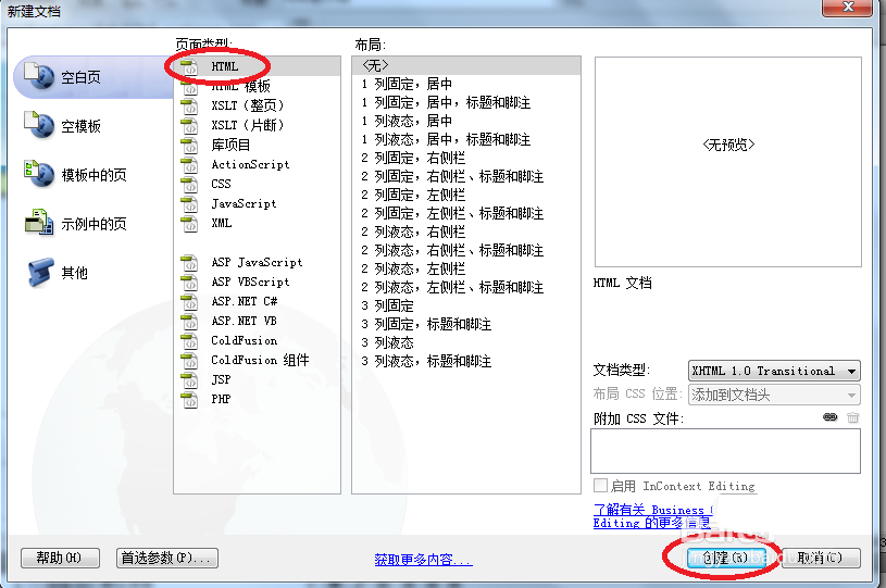 2、要制作弹出网页窗口,第一步就是要先新建制作一个网页。点击文件\新建。在“新建文档”对话框中选择html,创建。
