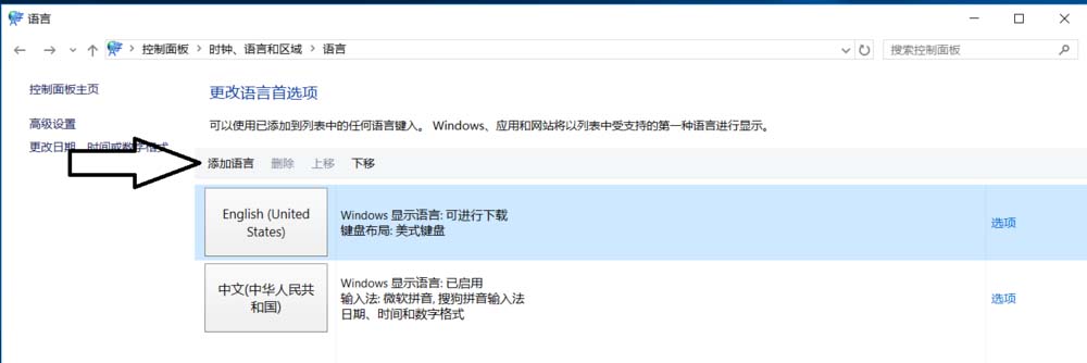 3、在“语言”设置里点击“添加语言” ,“更改语言首选项中”单击“添加语言”