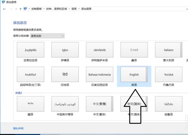 4、在添加语言设置下拉菜单里选择“英语”,并点击“打开”按钮