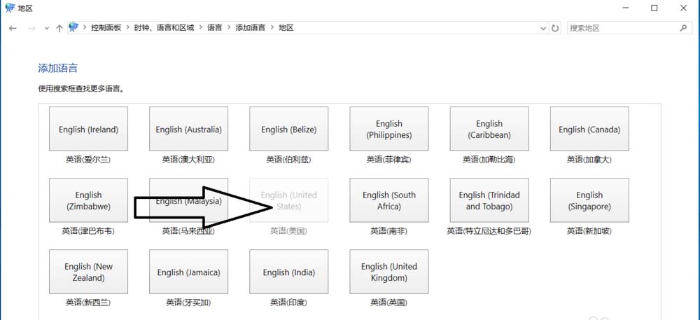5、设置页面里选择“英语(美国)” ,并点击“添加”按钮;