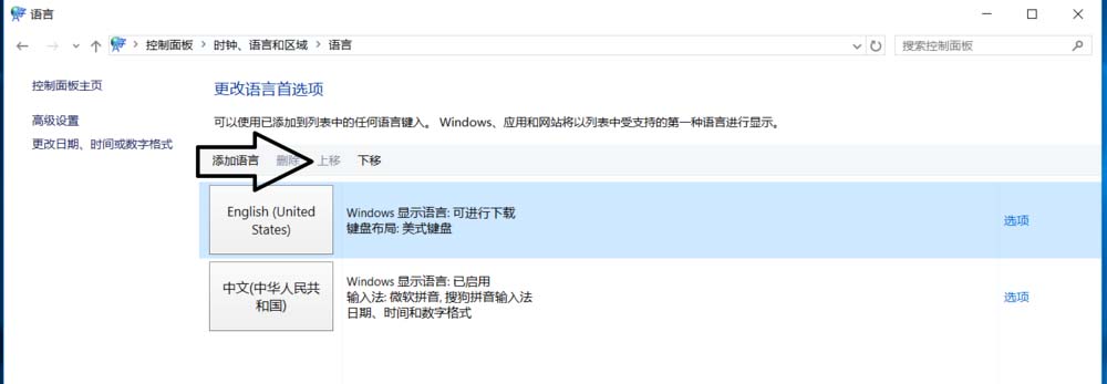 6、在“语言”设置页面选择“中文”,点击“下移”(这会让系统自带应用变成英文);让英语项在最上面。