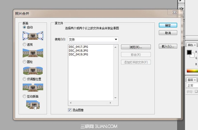 依次点击左上角“文件”-“自动”-“photomerge”,出现下面的界面:点击“浏览”,选择你存放需要合成的照片的文件夹,点“确定”。