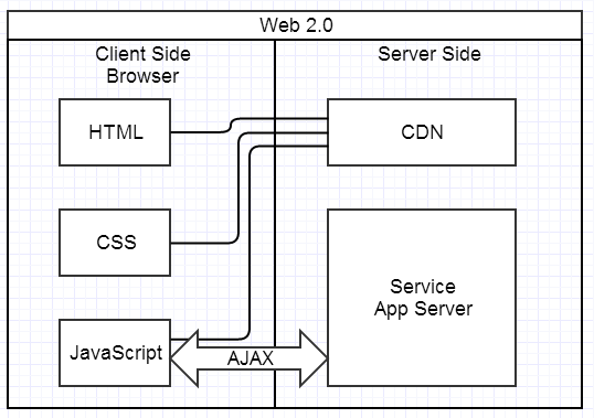 如下图所示,因为实际上HTML、CSS、JavaScript这些都逐渐静态化,所以不再需要把它们放在应用服务器上了,我们可以把它们放在专门的高性能静态服务器上,再进一步发展,就可以是CDN(Content Delivery Network,内容分发网络)。前端跟后端的通信,基本都是通过AJAX来,也会有一些其他的比如WebSocket之类,总之尽量少刷新了。
