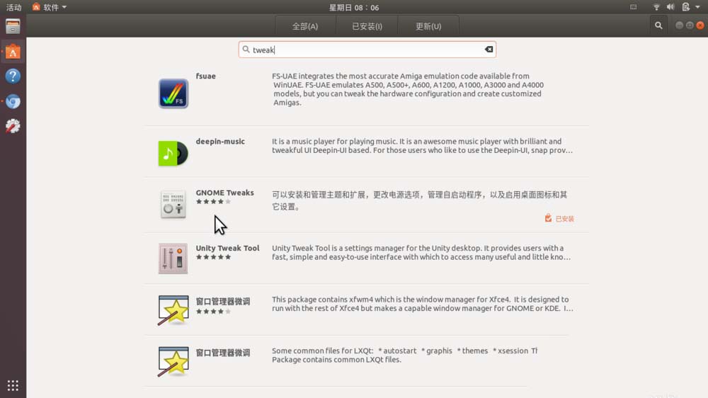 3、在搜索窗口中,输入“tweak”或“优化”,都能找到“Gnome Tweaks”这个软件。点击进入详情窗口,继续点击“安装”,完成安装“Gnome 优化”这个软件。