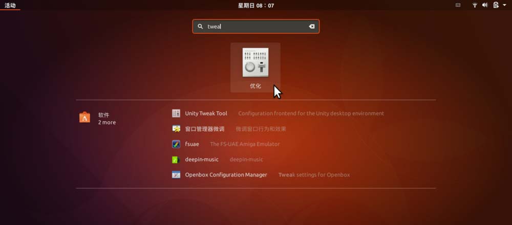 1、安装好 Gnome 优化软件后,按下Win键进入概览视图,在搜索框中输入“tweak”或“优化”,下方将会出现 Gnome 优化的图标,点击启动它。