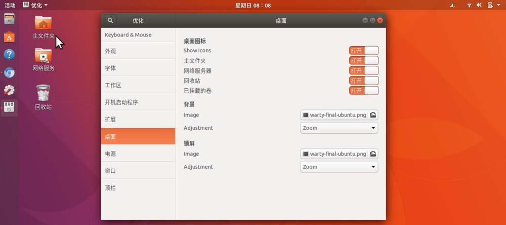 2、在打开的 Gnome 优化窗口中,在左侧导航列表中单击“桌面”,然后打开窗口右侧的“Show Icons”开关。然后,视情况打开或关闭“主文件夹”、“网络服务器”、“回收站”、“已挂载的卷”等项目的开关。