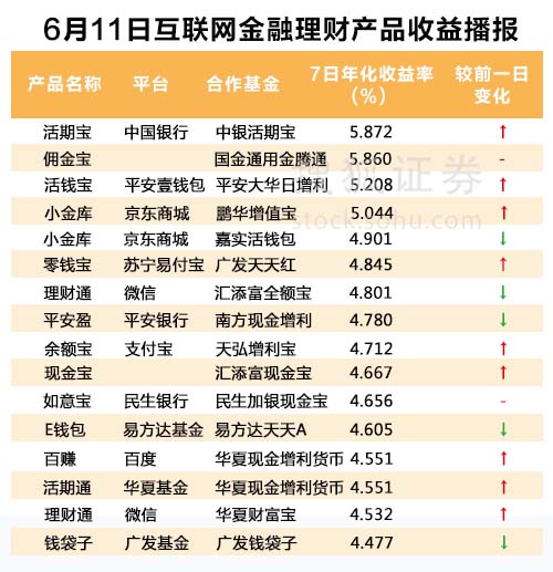 6月11日,互联网金融主要理财产品收益率涨跌不一,其中,中银活期宝7日年化收益率较前一日飞涨至5.872%,佣金宝收益5.860%紧随其后,京东小金库鹏华增值宝收益重返5时代。