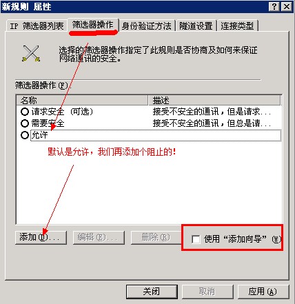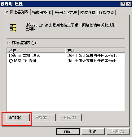 这上面就是一个阻止所有的策略了,下面我们要逐个放行,其实具体过程和上面是一样的;设置“IP筛选器列表”可以改成允许相关的端口,比如说“远程”那么默认的远程端口就是3389