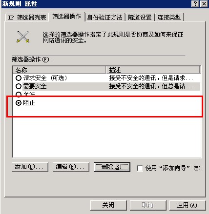 12. 点击上图中的确定,再回到“新规则属性”下面,之前设置的是“IP筛选器列表”,现在设置“筛选器操作”