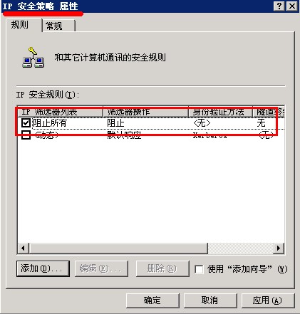 16. 上面都设置好了,确定好后我们再回到最原始的窗口也就是“IP安全策略属性里”我们可以看到一个“阻止所有”的策略了