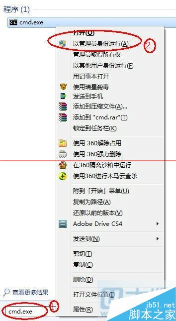 1、单击开始按钮,在开始搜索框中键入 cmd.exe。弹出对应的程序后,右击,选择“以管理员身份运行”。进入后,点击“是”