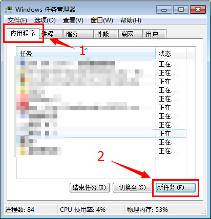 1、按下Ctrl+Alt+Del键调出任务管理器。然后点击“应用程序”下面的“新任务”按钮。