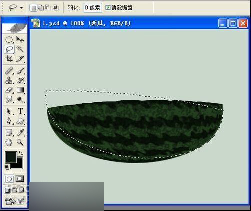 7.使用套索工具,沿着上部线条边缘套出选区,删除。这样做是为了使瓜肉的切面不会太平滑。也可以用橡皮工具,选择100%硬度的笔头拭擦,甚至也可以用滤镜做出不规则边缘的效果。其实同一种效果有许多不同的实现方法,我们只要选择适合自己的就好。