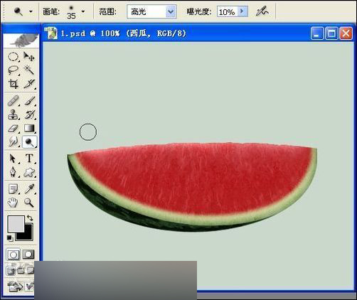 16.在使用加深减淡工具的时候,建议复制一层来做,因为不经意间就涂抹了无数次,而历史记录的恢复次数有限,复制图层来处理,不满意了可以扔掉重做。选择减淡工具,通过改变减淡的范围和曝光度,处理接近瓜瓤和中间起沙的位置,使瓜肉显得生动。