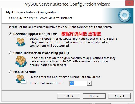 3.设置数据库访问量连接数为15、端口为3306(代码中设置URL用到)、编码方式为utf-8