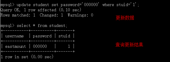 mysql> update student set password='000000' where stuid='1';